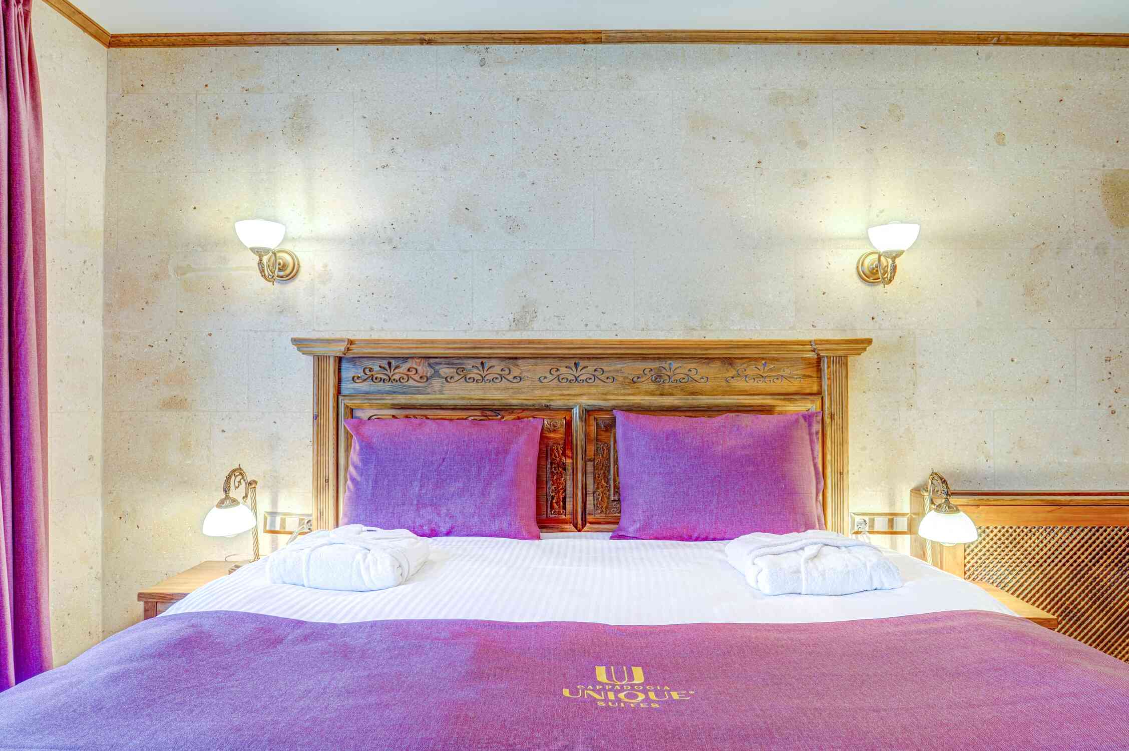 The Standard Room at Unique Cappadocia Palace offers a comfortable 36-square-meter space designed for those who seek simplicity and convenience. The room features a double bed with a custom-carved wooden headboard, a wooden sofa seating area, a work desk, and a vanity table. Central air conditioning and underfloor heating ensure a pleasant environment throughout the year.