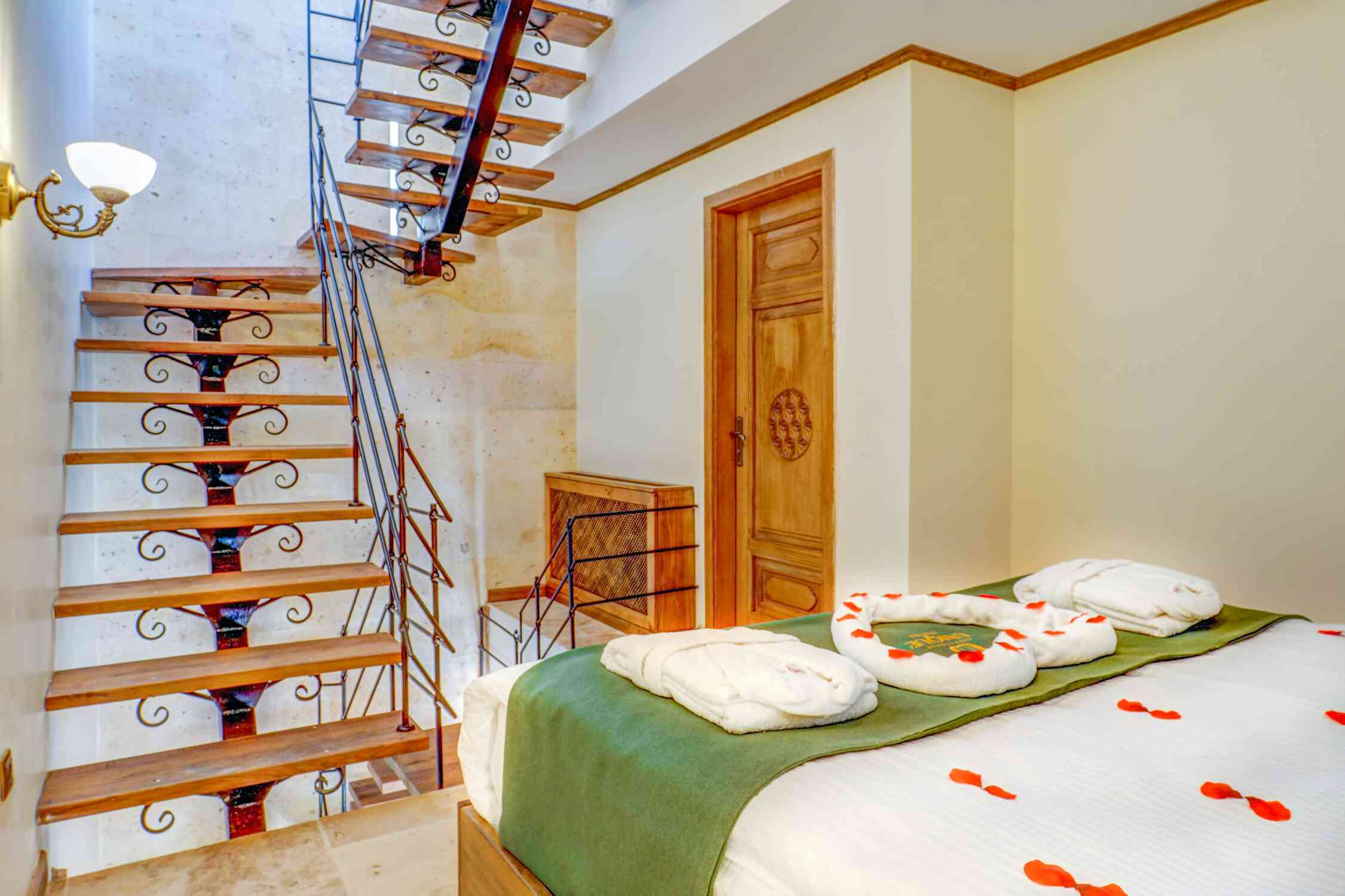The Terrace Jacuzzi Suite Room at Unique Cappadocia Palace offers a luxurious 60-square-meter, two-story space with breathtaking views of Cappadocia. The lower level includes a cozy sitting area with a wooden sofa, work desk, and vanity table, while the upper level features the bedroom with a double bed. The room’s highlight is its private terrace, complete with a jacuzzi, offering the perfect spot to relax and enjoy the stunning scenery of the region.